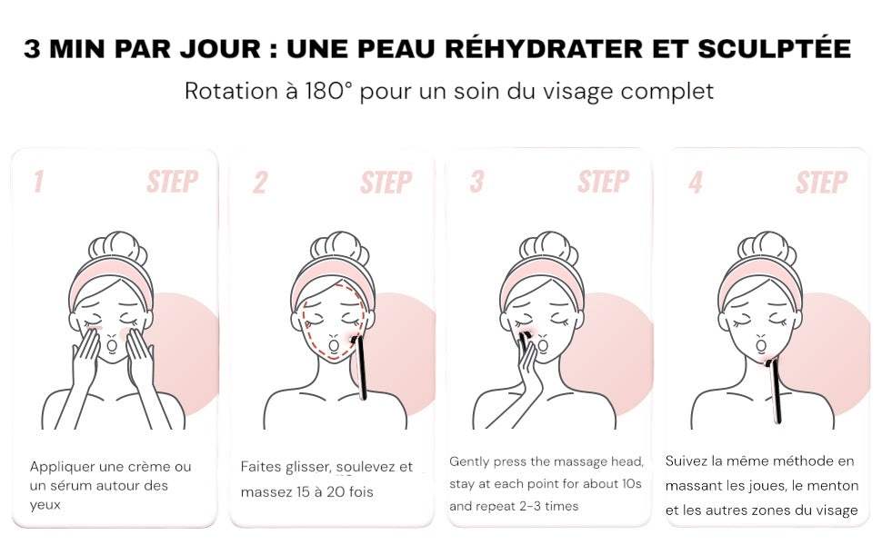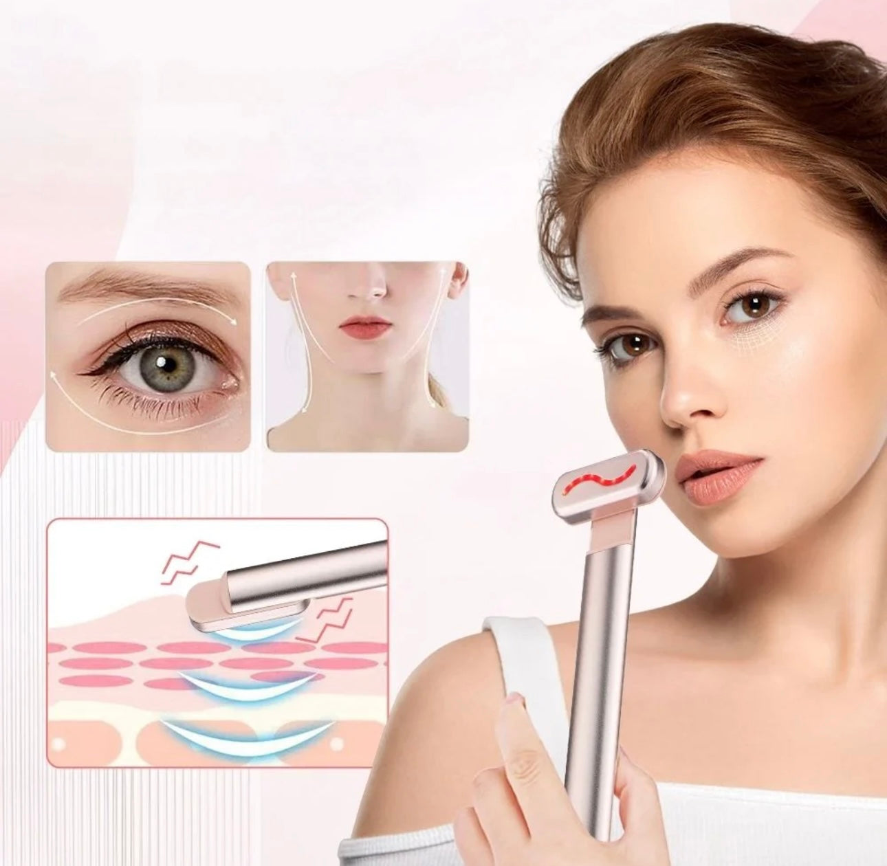 Dites adieu au rouleau de jade, au micro-courant, à l’outil de Gua Sha et au masque LED rouge. Cette baguette multifonction réunit tout en un seul geste : massage, lumière, chaleur et raffermissement. Un soin complet, sans douleur, directement chez vous.